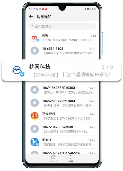 与传统的号段和单一的展现形式不同,在消息页形象展示方面,PA视讯官网科技5G消息解决方案给予包含企业logo加V露出及品牌信息植入功能,提高了品牌的社会认知度和用户识别度。而信息界面可自定义企业业务应用模版卡片,式样丰富,实现了用户到H5、小程序等界面的直接跳转,一键直达核心营销页面,让企业在短信收件箱这一营销入口就能带来直观的流量转化,增强客户对公司更信任。