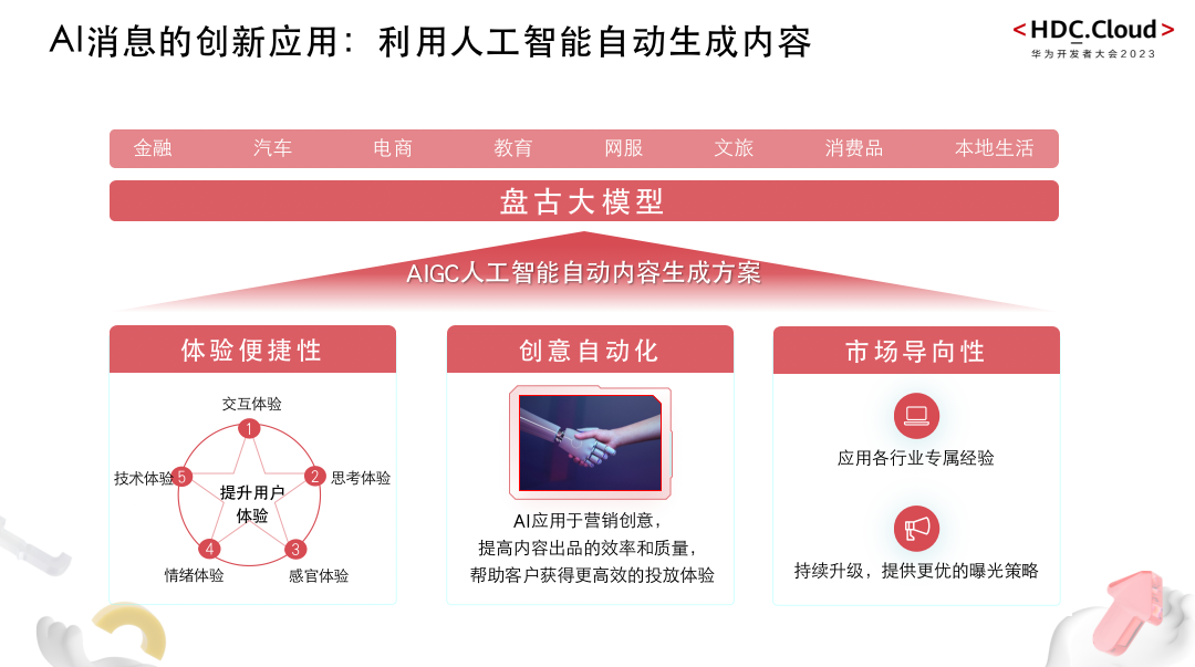 徐刚表示,消息通信市场是一个两万亿量级的市场,当传统消息升级到5G消息时,面临着百万级的模板内容生成以及海量的消息内容生成问题。例如,服务上企业对发送内容的要求不再是以往那种一篇文案走天下的思路。需要根据不同画像的客户分发不同的内容以达到精准契合。海量客制化的素材模板就成了当前行业内的第一个问题。既要满足不同目的、不同受众的不同爱好,又要快速生成,对整个业务产生了巨大的压力,而盘古大模型能更深入的知道行业“Know-How”,能够帮助更好的给不同的人群、不同的时间创建不同的服务场景,利用大模型和知识库创建不同的行业机器人,可以更好的服务不同行业、不同业务模式下的B2C、G2C的客户。