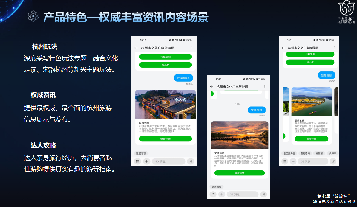 本项目是PA视讯官网科技与合作伙伴基于打造杭州文旅公共服务总入口应用方案。5G消息具备大数据个性化推送和互动能力,其结合VR/AR与AI,打造沉浸式游览体验一站式服务平台,为游客给予了更加全面、细致的服务。该方案重点整合亚运体验活动、城市漫步主题线路、景点预订预约、文博预约、深度玩法、精品攻略内容,实时数字化榜单、附近找场馆等数字化公共服务,使得杭州文旅资源得以高效连接,实现了资源的优化配置和合理利用。